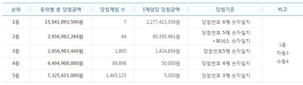 당첨번호 5개를 맞힌 3등은 1,865명으로 각각 142만원씩 받는다. 당첨번호 4개를 맞힌 4등(고정 당첨금 5만원)은 8만9,898명, 당첨번호 3개가 일치한 5등(고정 당첨금 5,000원)은 146만5,123명이다.