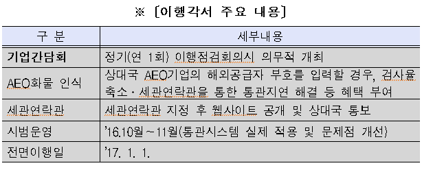양국 관세청은 MRA 체결 이후 약 9개월 동안 AEO화물 인식방법, 시범운영 절차 등 세부 이행절차에 대해 협상 후 최종 합의에 이르게 되었다.