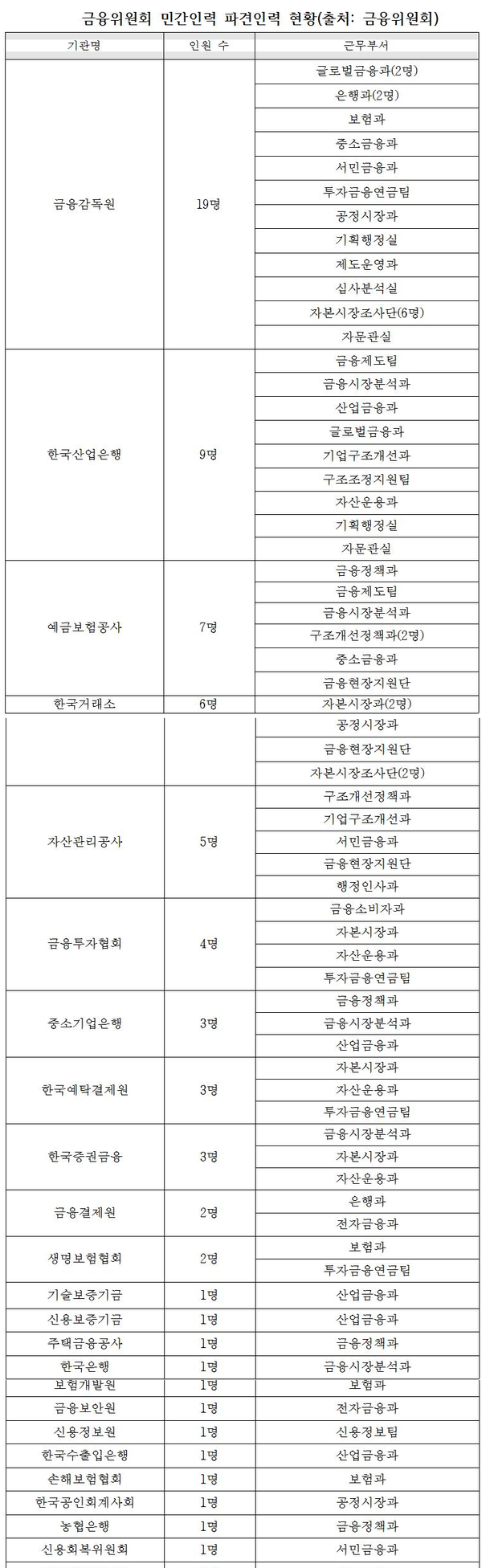 피파견 기관 인원을 살펴보면 금융감독원 19명, 산업은행 9명, 예금보험공사 7명, 한국거래소 6, 자산관리공사 5명 등이다.