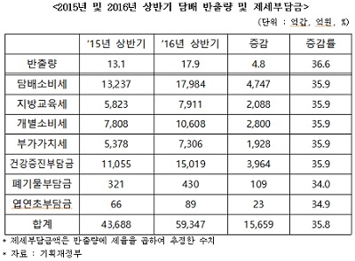 박 의원이 기획재정부로부터 제출받은 자료에 따르면 2016년 상반기 담배 반출량은 17억9천만 갑으로 2015년 상반기 반출량 13억1천만 갑보다 36.6% 증가한 것으로 나타났다.