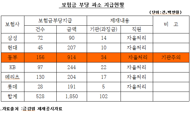 금감원이 발표한 2015년 금융민원 현황을 보면 손해보험사는 2014년보다 무려 14.4%나 급증했으며, 특히, 동부화재는 156건에 9억여원이나 부당 미지급 했음에도 고작 과징금 3,400만원에 기관주의에 그쳤다.