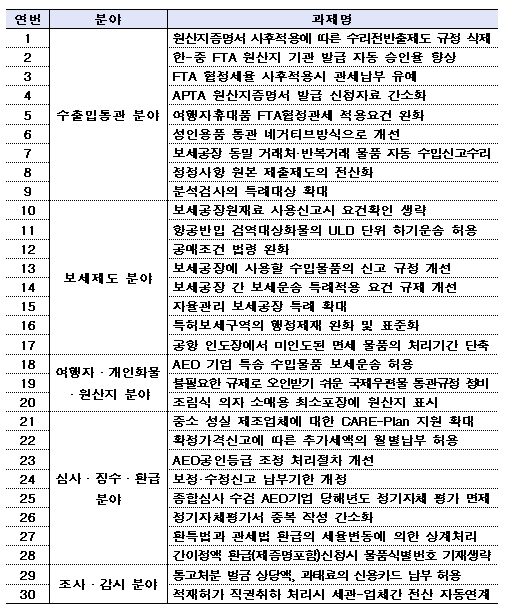 관세청에 따르면, 이번 규제개혁 추진과제는 5월부터 6월까지 ‘관세행정 규제개혁 대국민 공모전’을 개최하고 내부직원의 개선의견을 수렴해 총 118건의 규제개혁 과제를 발굴했으며, 이후 약 한 달간 실무부서의 심도 있는 검토를 거쳐 총 30건을 최종 선정했다.