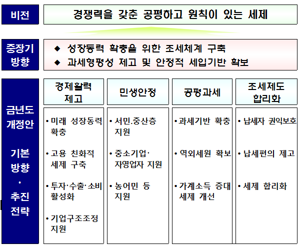 올해 세법개정안은 미래 성장동력을 확충하고 고용 친화적인 세제를 구축하며 경제에 활력을 불어넣는 동시에 서민·중산층 지원으로 민생을 안정시키는 방향으로 마련됐다.
