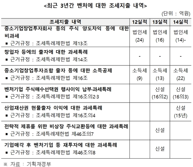 이와 함께 정부의 벤처 지원 조세지출 내역을 세부적으로 살펴보더라도 최근 3년 간 중소기업창업 투자회사 등의 주식양도차익 등에 대한 법인세 비과세 54억 원, 중소기업창업투자조합 출자 등에 대한 소득세 소득공제 44억 원에 불과한 수준이다.