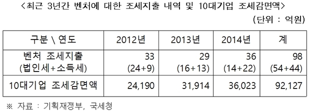 국회 기획재정위원회 간사를 맡고 있는 박광온 의원(더불어민주당, 수원 정)은 기획재정부로부터 제출받은 최근 3년간 벤처 지원 내역 및 실적 자료를 분석한 결과 2012년부터 2014년까지 세법개정을 통해 실적이 집계된 내역은 2개 분야에 불과했으며, 조세지출 내역 또한 3년간 98억 원 수준으로 같은 기간 매출액 상위 10대기업의 조세감면액 9조2,127억 원에 비할 때 턱없이 낮은 수준이라고 밝혔다.
