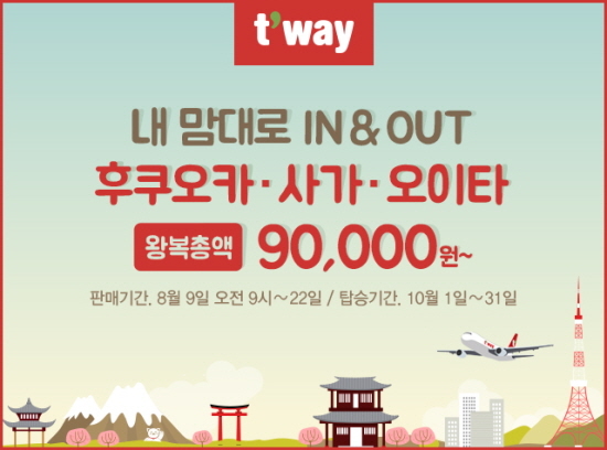 대상은 인천에서 출발하는 후쿠오카와 티웨이항공의 단독 노선인 사가, 오이타 총 3개 노선이다. 여행기간은 10월 1일부터 31일까지 한달 간으로 일부 제외기간이 있으며, 예약 상황에 따라 조기에 마감될 수 있다.