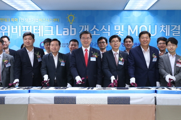 (조세금융신문=김사선 기자) 우리은행(은행장 이광구)은 10일 이광구 은행장, 주영섭 중소기업청장, 강시우 창업진흥원장, 조길형 영등포구청장 등이 참석한 가운데 ‘위비핀테크랩’을 열었다고 밝혔다. 사진은 10일 서울 영등포에 위치한 ‘위비핀테크랩’에서, 이광구 우리은행장(사진 앞줄 오른쪽 3번째)이 주영섭 중소기업청장(사진 앞줄 오른쪽 4번째), 강시우 창업진흥원장(사진 앞줄 오른쪽 5번째), 조길형 영등포구청장(사진 앞줄 오른쪽 2번째) 및 위비핀테크랩 입주선발 기업 대표들과 함께 ‘위비핀테크랩 개소식’을 기념하여 축하떡 커팅을 하고 있다.