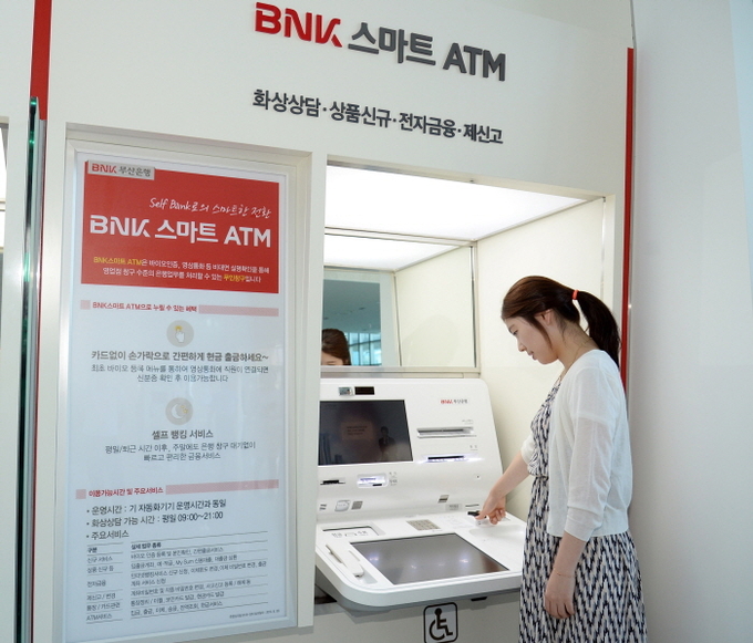 ‘스마트 ATM’이란 기존 은행 창구를 통해서 가능했던 각종 업무를 고객 본인이 처리할 수 있도록 개발된 새로운 개념의 금융기기로 부산은행은 국내 최초로 본인 인증을 위해 ‘지정맥 인증’과 ‘영상통화’ 기술을 도입했다. ‘지정맥 인증 기술’은 손가락 속 정맥을 지문처럼 인증키로 사용하는 생체보안 기술로 위·변조가 불가능해 보안성이 매우 뛰어나다.
