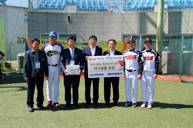 BNK캐피탈은 24일 오후, 장안천야구장(부산 기장군 소재)에서 열린 ‘라오 브라더스’ 팀과 박정태 레인보우희망재단 이사장(前 롯데자이언츠 코치)이 이끄는 ‘레인보우야구단’(부산지역 다문화 및 새터민 가정 청소년으로 구성된 야구단)의 친선경기 前, 각 야구단에 야구용품(야구공)을 전달하고 양 팀의 선전을 응원했다.