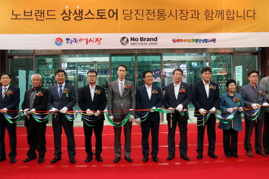 (조세금융신문=최일혁 기자) 31일 오후 충남 당진 당진어시장에서 당진 노브랜드 상생스토어 오픈 행사가 열린 가운데 참석 내빈들이 테이프 커팅에 임하고 있다. (좌측에서 네번째 정제의 당진 전통시장 상인회장, 다섯번째 이갑수 이마트 대표이사, 여섯번째 김홍장 당진시장)