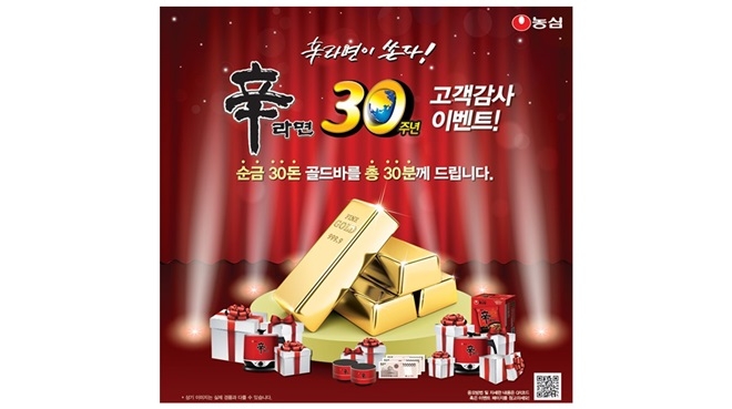 대표 이벤트인 ‘신라면 멀티팩 속, 황금 골든辛을 찾아라’의 경우 신라면 멀티팩에 무작위로 들어있는 쿠폰 일련번호를 이벤트 홈페이지(http://www.shinramyun.com/30th)에 입력하면 당첨여부를 확인할 수 있다. 1등 30명에게는 순금 30돈(112.5g)의 골드바가 주어지며, 이외에도 신라면 로고가 새겨진 블루투스 스피커, 라면포트, 신라면 큰사발 기프티콘 등의 경품이 제공된다.