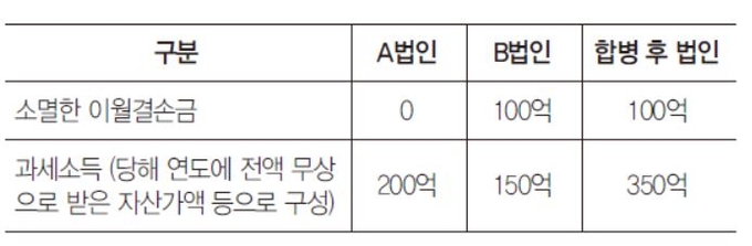 B법인이 A법인을 (적격)합병하는 경우 합병 후 법인의 과세소득은 250억이다. 무상으로 받은 자산가액 등 150억 중 100억을 소멸한 이월결손금에 보전·충당하여 과세소득을 산출할 수 있기 때문이다. 그러나, A법인이 B법인을 (적격) 합병하는 경우에는 피합병법인 B의 소멸 이월결손금을 합병 법인이 승계하지 못함으로 인하여 합병 후 법인의 과세소득은 350억으로 계산된다.