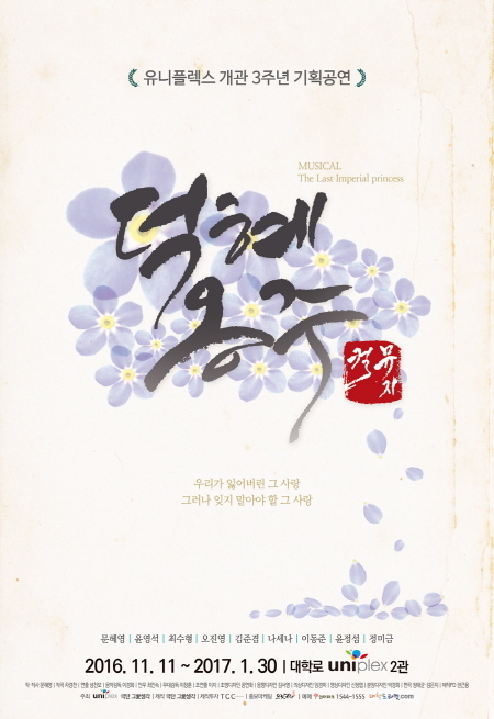 뮤지컬 ‘덕혜옹주’는 오는 2016년 11월 11일부터 2017년 1월 30일까지 대학로 유니플렉스 2관에서 공연된다.