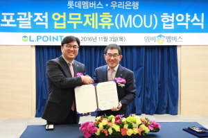 (조세금융신문=최일혁 기자) 우리은행은 3일 서울시 중구 소공로 소재 우리은행 본점에서 우리은행 남기명 국내그룹장, 롯데멤버스(주) 강승하 대표이사 등이 참석한 가운데, L.POINT를 운영하고 있는 롯데멤버스(주)와 포인트 제휴 관련 업무협약을 체결했다고 밝혔다.