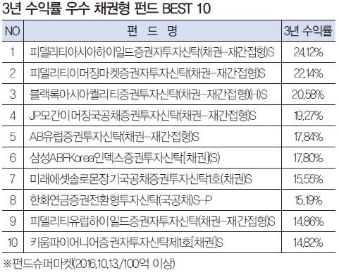 수익률이 우수한 채권형 펀드들은 주식형 펀드 못지않은 성과를 창출했고, 10개 중 6개는 해외채권펀드라는 것을 확인할 수 있다. 아시아, 유럽, 국내 등 투자지역뿐만 아니라, 하이일드, 국공채 등 투자대상 채권 종류도 다양하다.