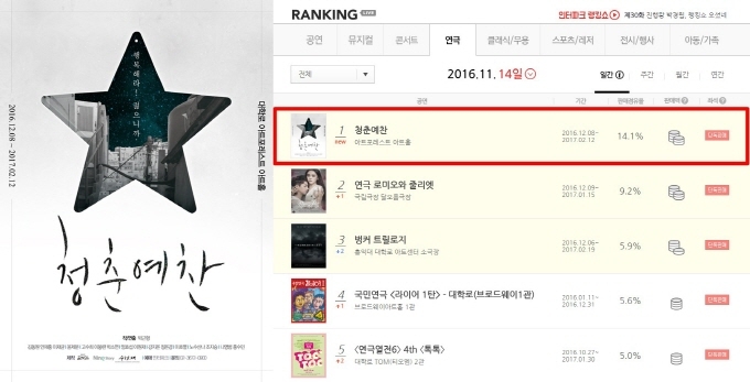 (조세금융신문=김명진 기자) 연극 ‘청춘예찬’이 1차 티켓 오픈과 동시에 예매사이트 인터파크 랭킹 1위를 기록하며 올 연말 흥행을 예고했다.