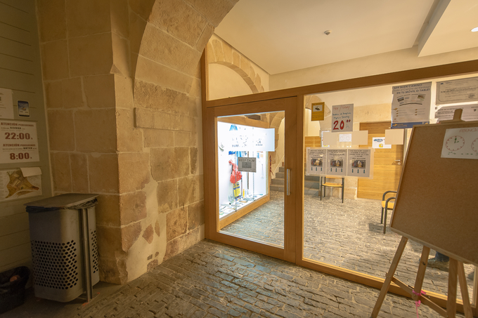 수도원 알베르게 사무실 입구이다. 신고 온 신발은 따로 보관하고 슬리퍼나 덧신 등으로 바꿔 신고 올라가야