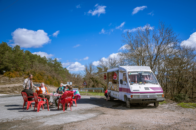 숲길을 지나서 내려오니 아스팔트 도로를 지나게 되는데 그 옆에 이동식 카페가 서 있다. 맑은 날씨 따가운