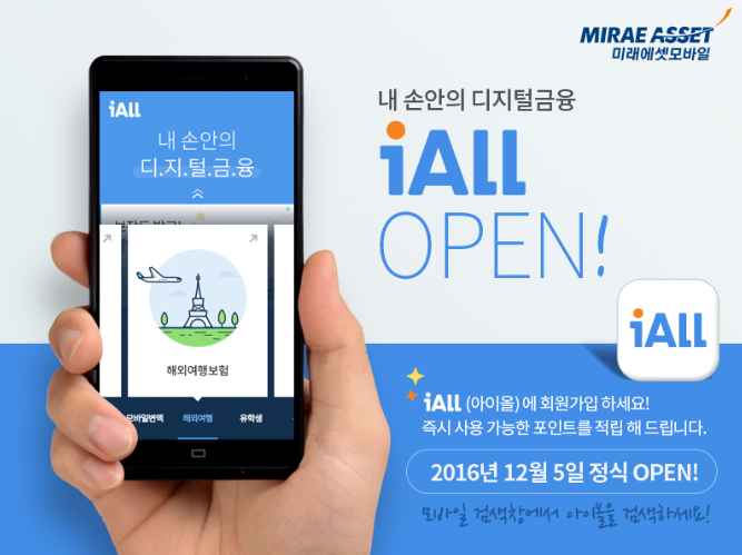 (조세금융신문=최일혁 기자) 미래에셋의 모바일금융 전문 계열사 미래에셋모바일㈜은 5일 모바일 금융·보험 오픈마켓 ‘iALL’(아이올)을 오픈한다고 밝혔다.