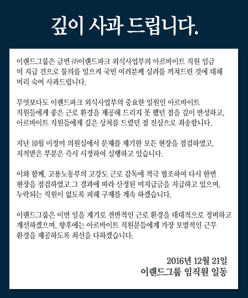 이랜드그룹은 “국민 여러분께 심려를 끼쳐드린 것에 대해 머리 숙여 사과 드린다”며 “무엇보다도 이랜드파크 외식사업부의 중요한 일원인 아르바이트 직원들에게 좋은 근로 환경을 제공해 드리지 못했던 점을 깊이 반성하고, 아르바이트 직원들에게 깊은 상처를 드렸던 점 진심으로 죄송하다”고 밝혔다.