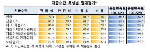 조사결과 지급수단별 편리성‧안전성‧수용성‧비용 4개 주요특성을 종합한 만족도 결과에서는 현금(83.2점)이 가장 만족도가 컸고 뒤를 이어 신용카드(80.8점), 체크‧직불카드(76.0점)순으로 만족도가 높았다.