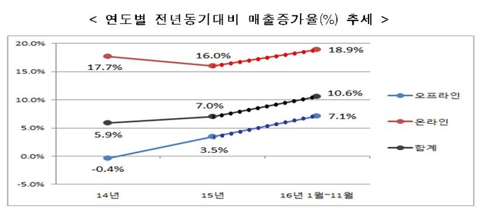 산업통상자원부는 11월 국내 주요 유통업체 매출을 조사한 결과 전년동기대비 온라인 유통업체 매출은 20.2% 증가했고 오프라인 유통업체 매출은 0.3% 증가해 전체적으로 6.5% 올랐다고 29일 밝혔다.