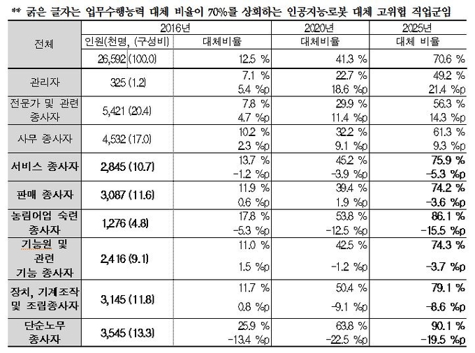 지난 해 우리나라 전체 직업종사자 2659만명 중 12.5%인 3만3000여명의 업무수행능력은 현재 인공지능·로봇으로 대체 가능한 것으로 나타났다. 이 비율은 2020년에 41.3%, 2025년에는 70.6%인 1575만7000여명으로 올라갈 것으로 전망됐다.