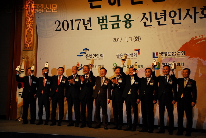(조세금융신문=김필주 기자) 각 부문별 다산금융상 수상자들이 트로피를 들어 자축하고 있다. 임종룡 금융위원장(좌측에서 다섯번째)도 함께 축하를 나주고 있다