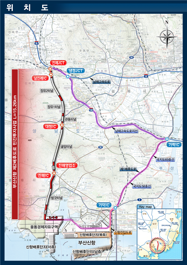 국토교통부에 따르면 ‘부산항신항 제2 배후도로’는 지난 2012년 공사에 착공했고 부산항신항의 웅동지구에서 남해고속도로 진례분기점을 연결하는 연장 15.3km의 왕복 4차선 도로로 총 6281억원의 사업비가 투입됐다.