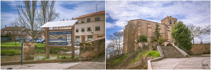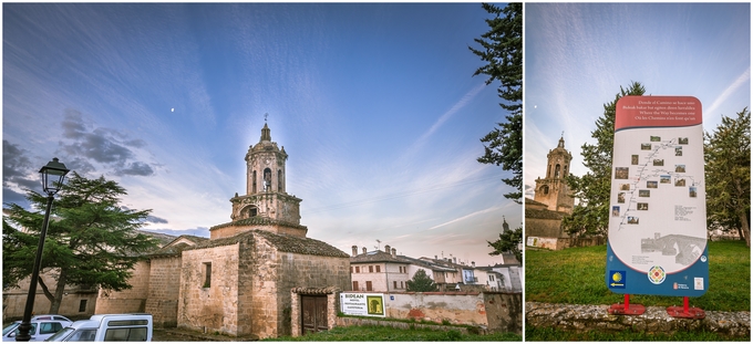 ▲ 알베르게 앞의 성당과 순례길 안내도판이다. 지역별로 대표적인 볼거리 사진을 같이 붙여서 만들어 놓았다.