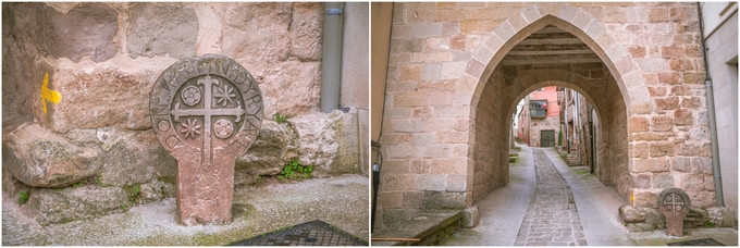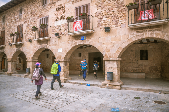 함께 마을을 지나간다. 건물에 있는 문을 통과해서 지나가는 곳에 탁자와 함께 순례자 도장을 찍을 수 있도록