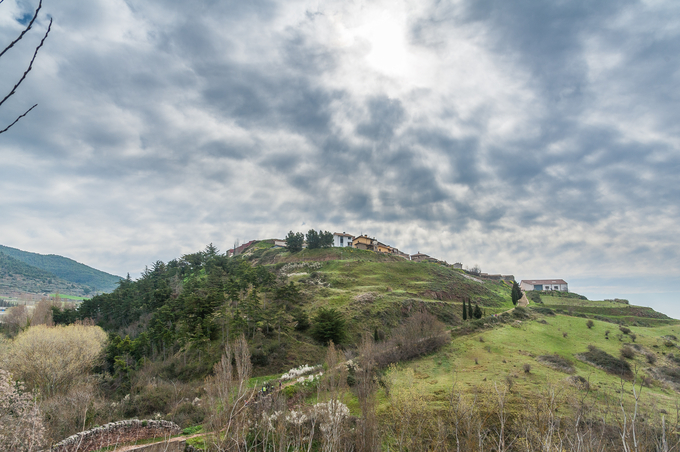 ▲ 오르막 길을 오르고 있는 순례자들과 언덕 위에 있는 집들……