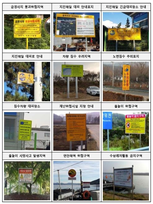 자치단체 설치·관리 안전표지판 지원대상으로는 급경사지 붕괴위험지역 위험표지, 지진해일 대피안내 표지판, 차량 침수 우려지역 안내판, 물놀이 위험구역 설정안내 표지판, 수상레저 활동 금지구역 공고판 등 15개가 있다.