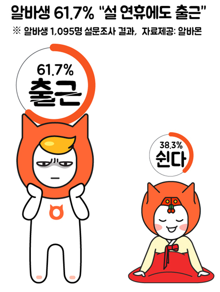 19일 알바몬이 최근 알바생 1,095명을 대상으로 ‘설 연휴 아르바이트 여부’를 실시한 결과 발표에 따르면 설문에 응답한 알바생 중 절반을 훌쩍 넘는 61.7%의 알바생이 ‘올 설 연휴에도 출근한다’고 답했다. 아