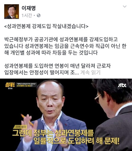 이와 함께 이재명 시장은 “성과연봉제는 근로자 지위에 중대한 영향을 미치기 때문에 노사합의에 따라 도입 여부를 결정해야 한다(불이익변경금지 원칙)”며 “보수 논객인 전원책 변호사님도 해외에서 공공기관과 금융권에 성과연봉제를 도입했다가 큰 부작용을 겪었다고 지적할 정도”라며 공공기관과 금융권의 ‘성과연봉제 강제도입’ 반대를 분명히 했다.