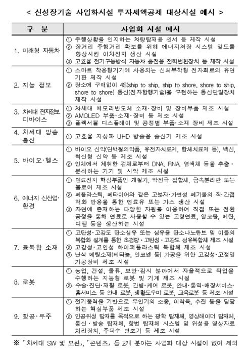 이번에 시행규칙에 의해 신성장기술 사업화시설 투자세액공제 대상이 된 시설은 모두 9개로 ▲미래형 자동차 ▲지능 정보 ▲차세대 전자정보 디바이스 ▲차세대 방송통신 ▲바이오·헬스 ▲에너지 신산업·환경 ▲융복합 소재 ▲로봇 ▲항공·우주 등이다.