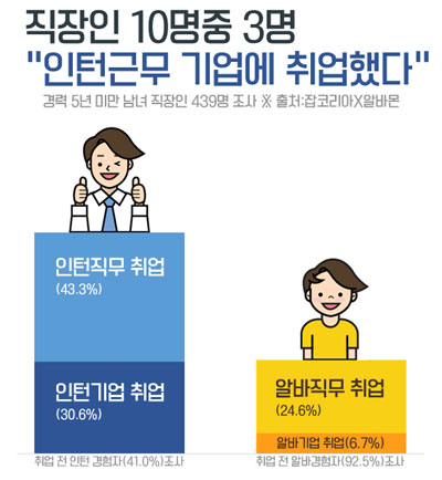 7일 잡코리아와 알바몬이 함께 경력 5년 미만의 남녀 직장인 439명을 대상으로 ‘인턴 및 알바 경험과 취업영향’에 대해 설문조사를 진행한 결과 직장인 중 ‘취업 전 인턴 근무를 한 경험자’는 41.0%였고, ‘취업 전 아르바이트를 했던 경험자‘는 92.5%에 달했다.