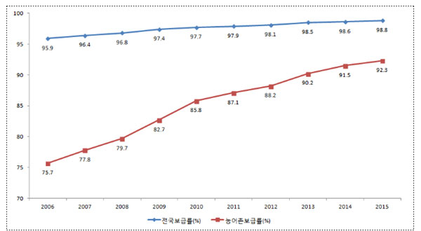 도시와 농어촌 간의 상수도 보급률의 격차는 여전하나, 매년 지속적인 감소 추세를 보이고 있다.