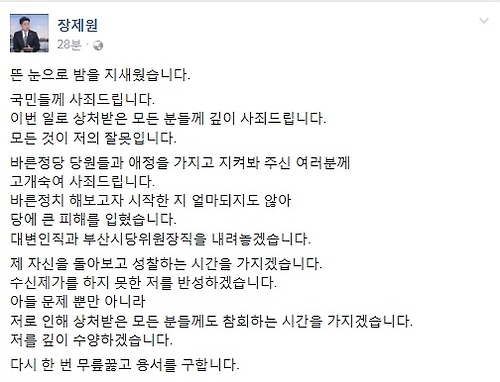 또 장제원 의원은 “바른정당 당원들과 애정을 가지고 지켜봐 주신 여러분께 고개 숙여 사죄 드린다”며 “바른정치 해보고자 시작한 지 얼마 되지도 않아 당에 큰 피해를 입혀 대변인직과 부산시당위원장직을 내려놓겠다”고 했다.