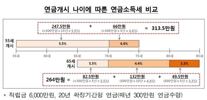예를 들어 적립금 6000만원, 연금수령기간이 20년, 매년 300만원 연금수령을 할 경우 연금개시나이가 55세인 경우 세금은 313만5000원이지만 65세부터 연금수령을 할 경우는 264만원의 세금만 내면 된다.