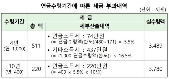 예를 들어 연금저축평가액(적립금)이 4000만원일 경우, 이를 4년간 분할수령(매년 1000만원)하게 되면 총 511만원의 세금을 내게 되지만, 10년간 분할수령(매년 400만원)하는 경우 절반 이내인 229만원만 내면 된다.