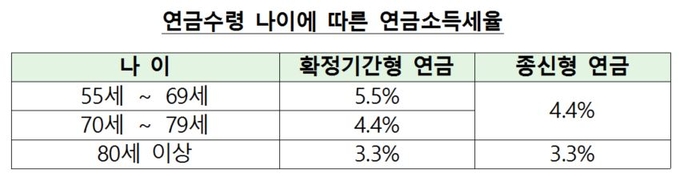 또한 연금수령 나이가 많을수록 낮은 세율이 적용된다는 점도 참고할 필요가 있다. 세법상 연금소득세는 가입자의 연금수령시 나이가 많을수록 세율이 적게 책정돼 있다. 경제적 여유가 있다면 연금 수령시기를 늦출수록 납부할 세금을 줄일 수 있다.