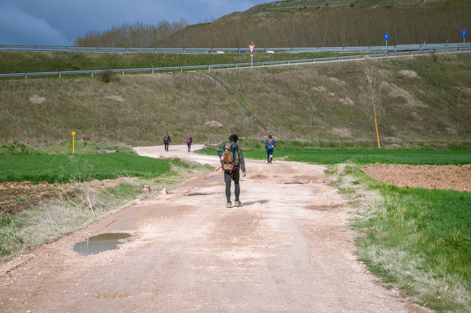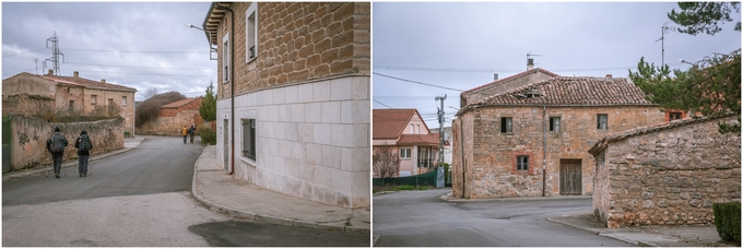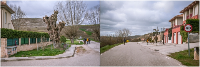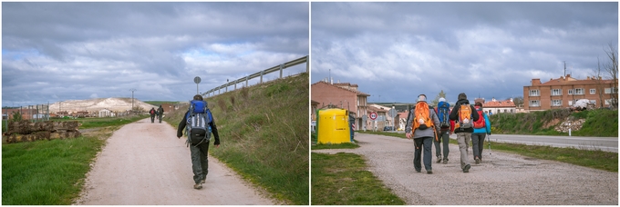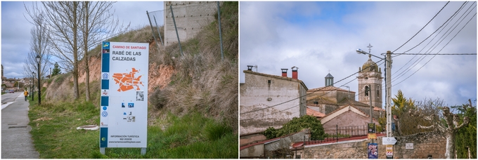 벗어나서 조금 오르막을 오르면 Rabe de las Calzadas가 보이기 시작한다. 마을과 떨어져서 한 두채씩 집이 보이다가 멀리 성당이 보이기 시작하면서 집이 많아진다. 앞에는 큰 길을 사이에 두고 마르코와 까를로가 양쪽으로 걸어가고 있다.