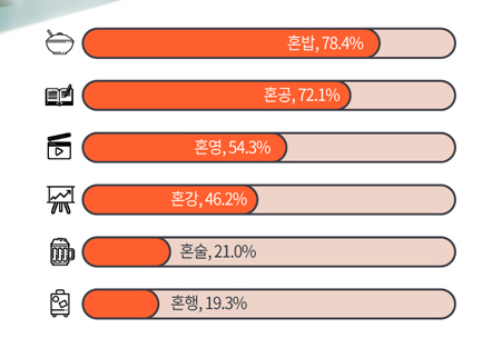 대학생들이 혼자서 해결하는 것들을 살펴 보면 혼자서 밥을 먹는 혼밥이 78.4%로 1위를 차지한 가운데, 혼공(혼자서 공부하기, 72.1%), 혼영(혼자서 영화보기, 54.3%), 혼강(혼자서 강의수강, 46.2%), 혼술(혼자서 술마시기, 21.0%), 혼행(혼자서 여행하기, 19.3%)의 순으로 나타났다.