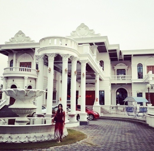 사진 속 신주아는 마치 궁전과 같은 화려하고 거대한 저택 앞에서 포즈를 취하고 있다.