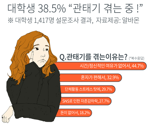 이들이 관태기를 겪고 있는 이유를 조사한 결과, ‘취업준비, 과제 등에 지쳐 인맥을 관리할(늘릴) 시간적, 정신적 여유가 없어서’라는 답변이 44.7%의 응답률로 1위를 기록했다.