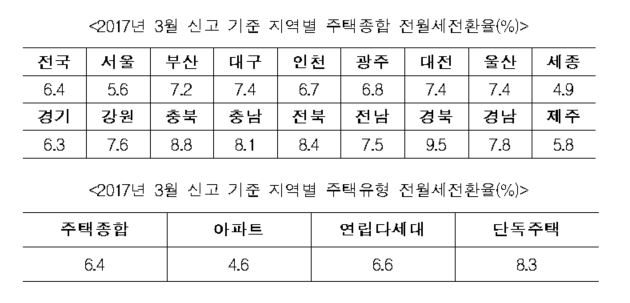 한국감정원은 2017년 3월 신고 기준 실거래정보를 활용해 전월세전환율을 산정한 결과 이같이 나타났다고 4일 밝혔다.