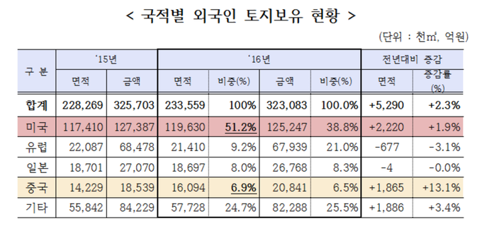 국적별로 미국은 전년대비 1.9% 증가한 1억1963만㎡로 전체 외국인 보유면적의 51.2%를 차지하고 있으며, 유럽은 9.2%, 일본 8.0%, 중국 6.9% 순으로 나타났다.