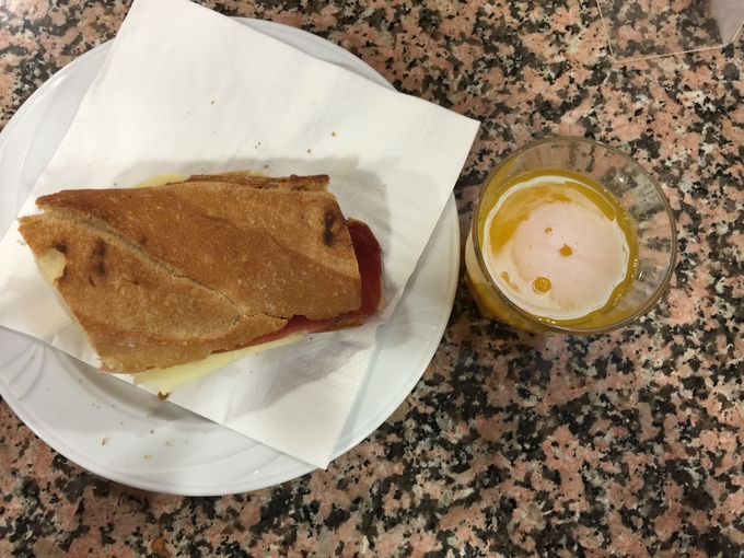 들어가니 아는 얼굴들이 반겨 준다. 갑자기 손님이 많아져서 자리가 모자란다. 식당으로 사용하는 공간까지 순례자들이 앉을 정도가 되고 주인장은 무척이나 바빠진다. 조금 이르기는 하지만 들어온 김에 바게트 샌드위치에 오렌지 주스를 점심 식사로 한다.