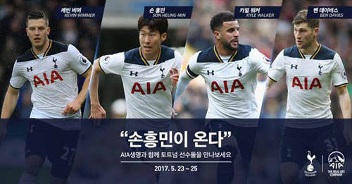 18일 AIA생명 한국지점 등에 따르면 손흥민 선수가 카일 워커, 케빈 비머, 벤 데이비스 등 동료 선수들을 이끌고 입국할 예정이며 함께 이틀간 국내 팬들과 만남의 자리를 갖는다.